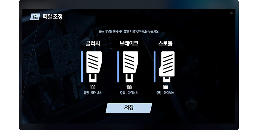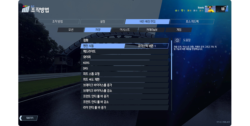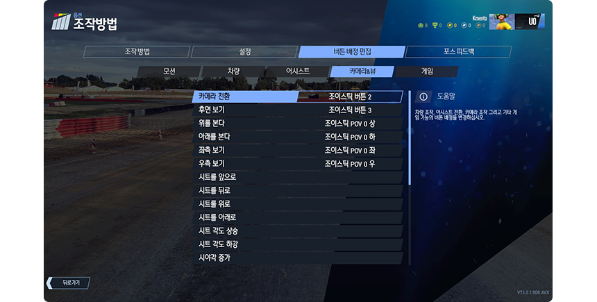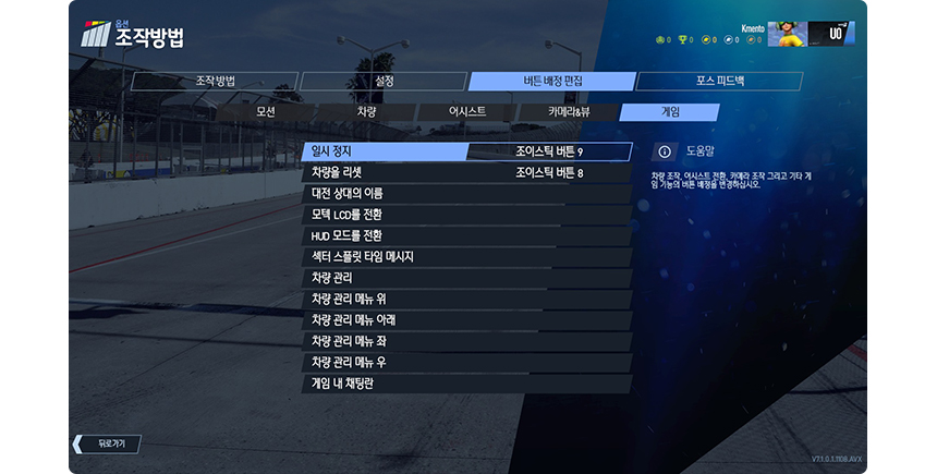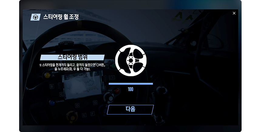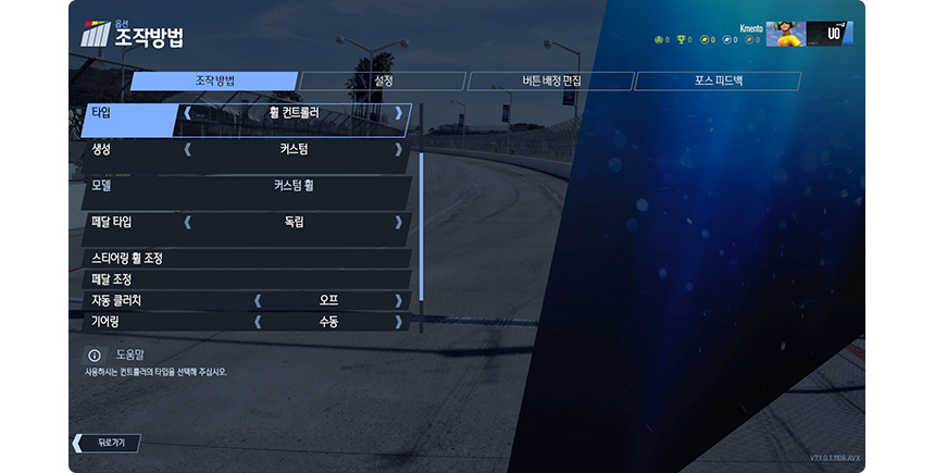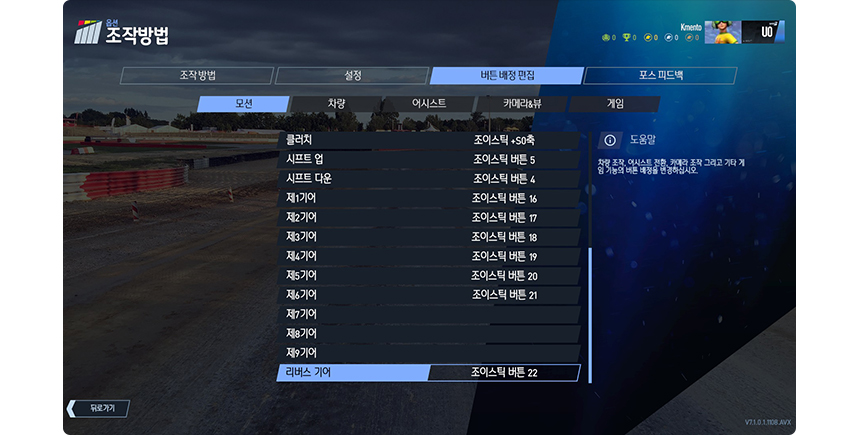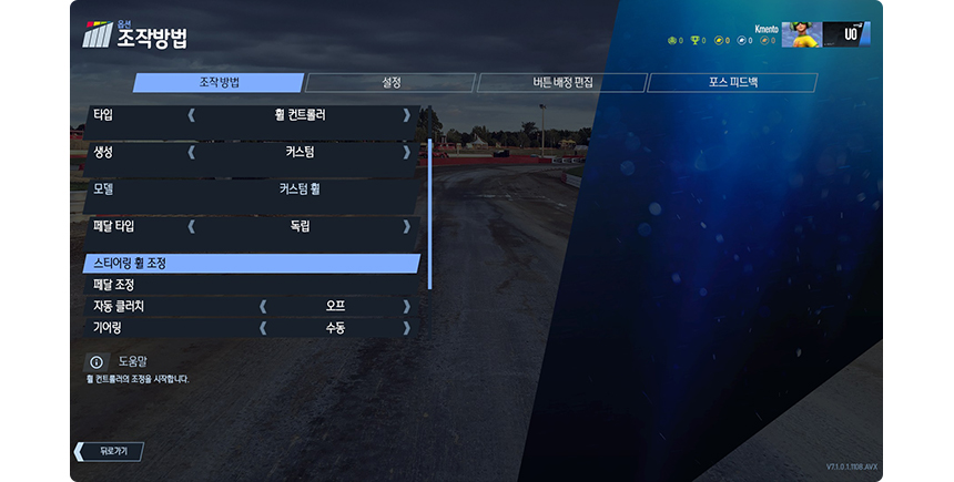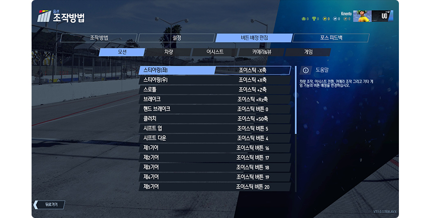 ![]() [조작 방법 - 타입] 휠 컨트롤러 ![]() ![]() [버튼 배정 편집 - 모션 탭] 스티어링, 스로틀, 브레이크, 클러치, 리버스 기어 등 엘리트 휠을 사용해 수동 입력해 주세요. ![]() ![]() ![]() 필요한 기능을 엘리트 휠을 사용해 수동 입력해 주세요. ![]() [조작방법 - 스티어링 휠, 페달 조정] 각 버튼을 클릭해 엘리트 휠로 수동 입력해 주세요. ![]() ![]() ![]() 모든 설정 후 "뒤로가기” 버튼을 눌러 게임화면으로 돌아갑니다. ![]() 고생하셨습니다. 즐거운 레이싱 게임 되시길 바랍니다 :)