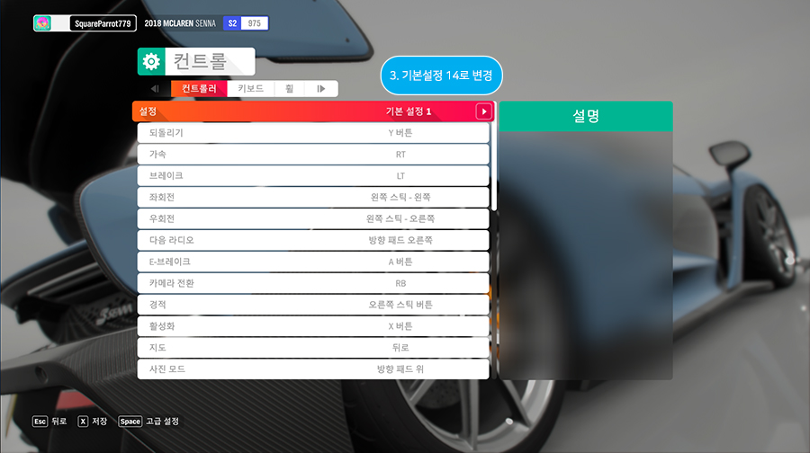 1. [홈] - [설정] 클릭 2. [컨트롤 설정] 클릭 3. '기본 설정 1'을 '기본 설정 14'로 변경 4. (기본 설정은 위의 이미지 참고) 해당 설정으로 되어 있는지 확인 - [저장] 클릭