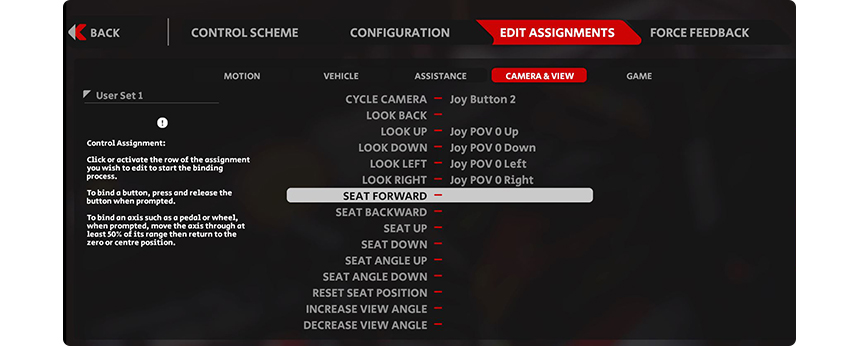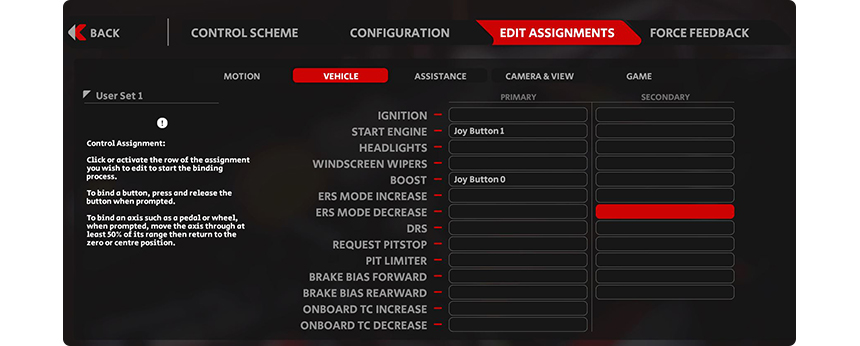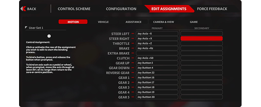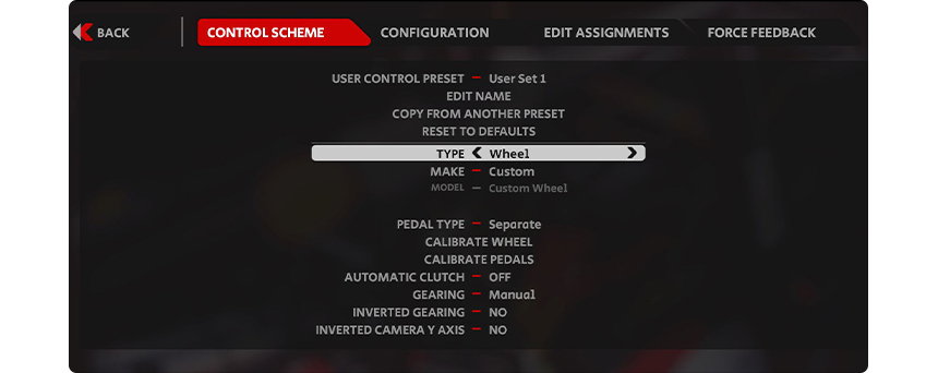 1. 게임 실행 > 옵션 > 컨트롤 탭을 선택 설정하려는 버튼을 키보드 Enter 또는 마우스로 클릭하면 설정 창이 뜨며 이때 엘리트 휠의 버튼을 누르면 설정됩니다. (다른 버튼의 설정 방법도 동일합니다.) 같은 방법으로 스티어, 스로틀, 브레이크, 클러치, 기어 올림, 기어 내림 등 모든 기능을 순서대로 커스텀 입력해 주세요.