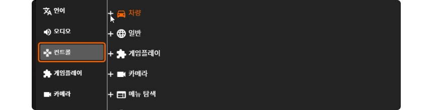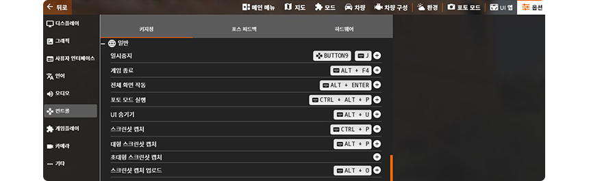 ![]() 게임 실행 > 옵션 > 일반 탭을 선택 필요한 기능을 수동 설정합니다. ![]() ![]() 게임 실행 > 옵션 > 게임플레이 탭을 선택 필요한 기능을 수동 설정합니다. ![]() ![]() 게임 실행 > 옵션 > 카메라탭을 선택 필요한 기능을 수동 설정합니다. ![]() ![]() 게임 실행 > 옵션 > 메뉴 탐색 탭을 선택 필요한 기능을 수동 설정합니다. ![]() ![]() 포스 피드백 수동 설정 필요한 기능을 수동 설정합니다. ![]() 모든 설정 후 상단의 “뒤로” 버튼을 눌러 게임화면으로 돌아갑니다.