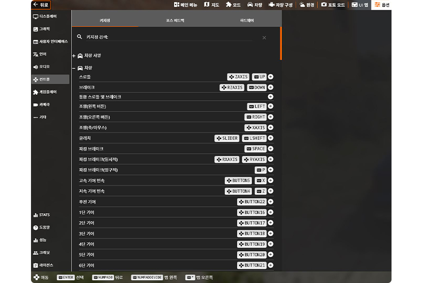 ![]() ![]() 게임 실행 > 옵션 > 차량 탭을 선택 설정하려는 버튼을 키보드 Enter 또는 마우스로 클릭하고 엘리트 휠의 버튼을 누르면 설정됩니다. (다른 버튼의 설정 방법도 동일합니다.) 같은 방법으로 스티어, 스로틀, 브레이크, 클러치, 기어 등 모든 기능을 순서대로 커스텀 입력해 주세요