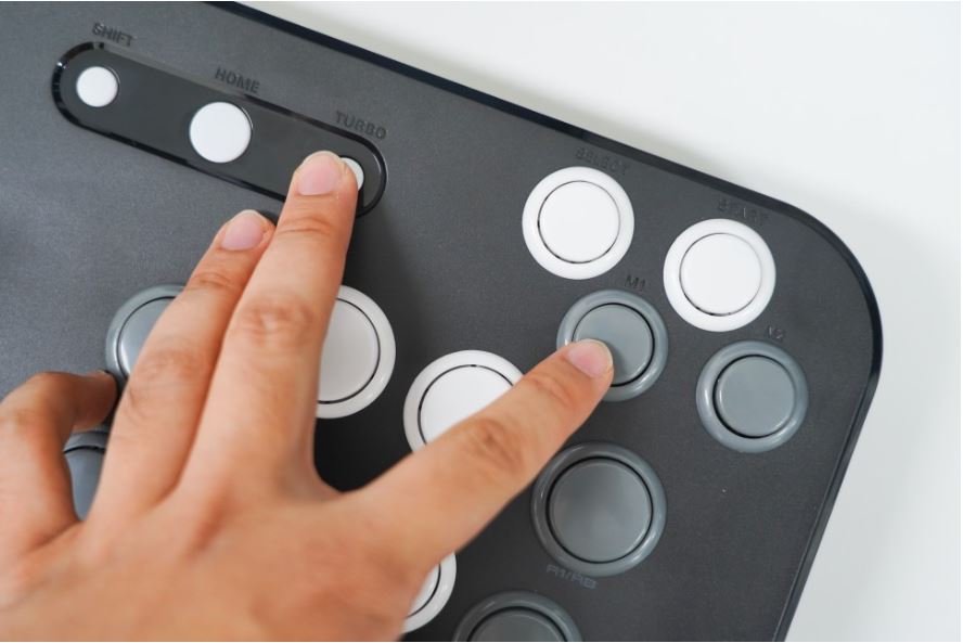 버튼은 8버튼 호리배열에 SHIFT / HOME / TURBO, 셀렉트 / 스타트, M1, M2 기능 버튼으로 구성되어 있습니다.