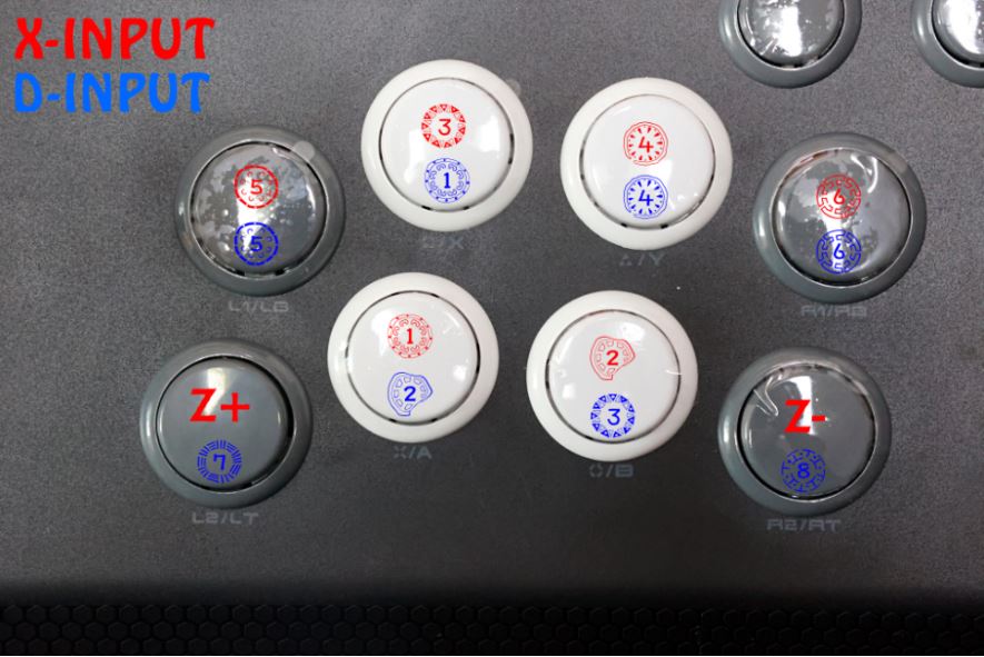 PC의 경우는 아무래도 X-INPUT 모드, D-INPUT 모드 두가지 설정이 가능하다 보니 버튼 배치를 알아 두시는 게 편한데 기능 버튼의 경우 아래 2개의 회색 버튼은 M1/M2 매크로에 사용이 되는 버튼이며 액션버튼 8개의 경우 X-INPUT 모드일때 위쪽은 순서대로 5,3,4,6 아래쪽은 Z+,1,2,Z- 버튼으로 인식되고 D-INPUT 모드일때 위쪽은 순서대로 5,1,4,6 아래쪽은 7,2,3,8로 인식되니 참고하시면 되겠다. 게임마다 레버 입력이 다르기 때문에 자유롭게 변환이 가능한데 철권태그의 경우 흰색 4개의버튼과 우측 상단의 6번 버튼을 주로 사용한다.